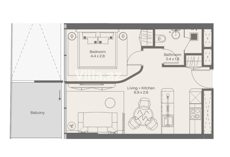 sanitar qovşağı və Qonaq otağından çıxışlı geniş balkon.